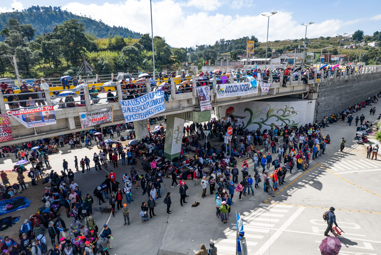 Seit Montag 2. Oktober steht das ganze Land still. Der Aufruf zum Protest durch Blockaden wichtiger Verkehrspunkte kam zuerst von den «48 Kantonen», eine indigene Verwaltungsstruktur aus dem überwiegend von Indigenen bewohnten Hochlanddepartament Totonicapán. Ihm schlossen sich schnell praktisch alle anzestralen Autoritäten des Landes, die für die aktuelle und historische Struktur des indigenen Widerstandes stehen, und schliesslich auch städtische soziale Bewegungen an. Der Menschenrechtsanwalt Miguel Mörth schreibt in seiner Kolumne für das Guatemalanetz Bern: «Tausende versperrten die Strasse, bauten Strukturen für die Versorgung auf und begannen ein Volksfest, das langsam auf das ganze Land übergriff. Am Dienstag wurden es immer mehr Blockaden, aber es war klar: Der Funken muss vor allem auf die Hauptstadt überspringen, die die indigenen Rebellionen oft im besten Fall mit Argwohn betrachtet hat. Deshalb hatten die indigenen Autoritäten von Anfang an entschieden, den Sitz der Generalstaatsanwaltschaft im Zentrum der Hauptstadt zum zweiten Symbol [der Proteste] zu machen und hier ihr Operationszentrum aufzubauen. Erst folgten Hunderte dem Aufruf, dann Tausende. Das Ministerio Público war umstellt.» Die Forderung, die einen Grossteil der Bevölkerung spätestens seit dem 2. Oktober eint: Die korrumpierte Generalstaatsanwältin Consuelo Porras und weitere korrupte Staatsanwälte und Richter, die den Machtwechsel aktiv verhindern wollen, müssen gehen!
