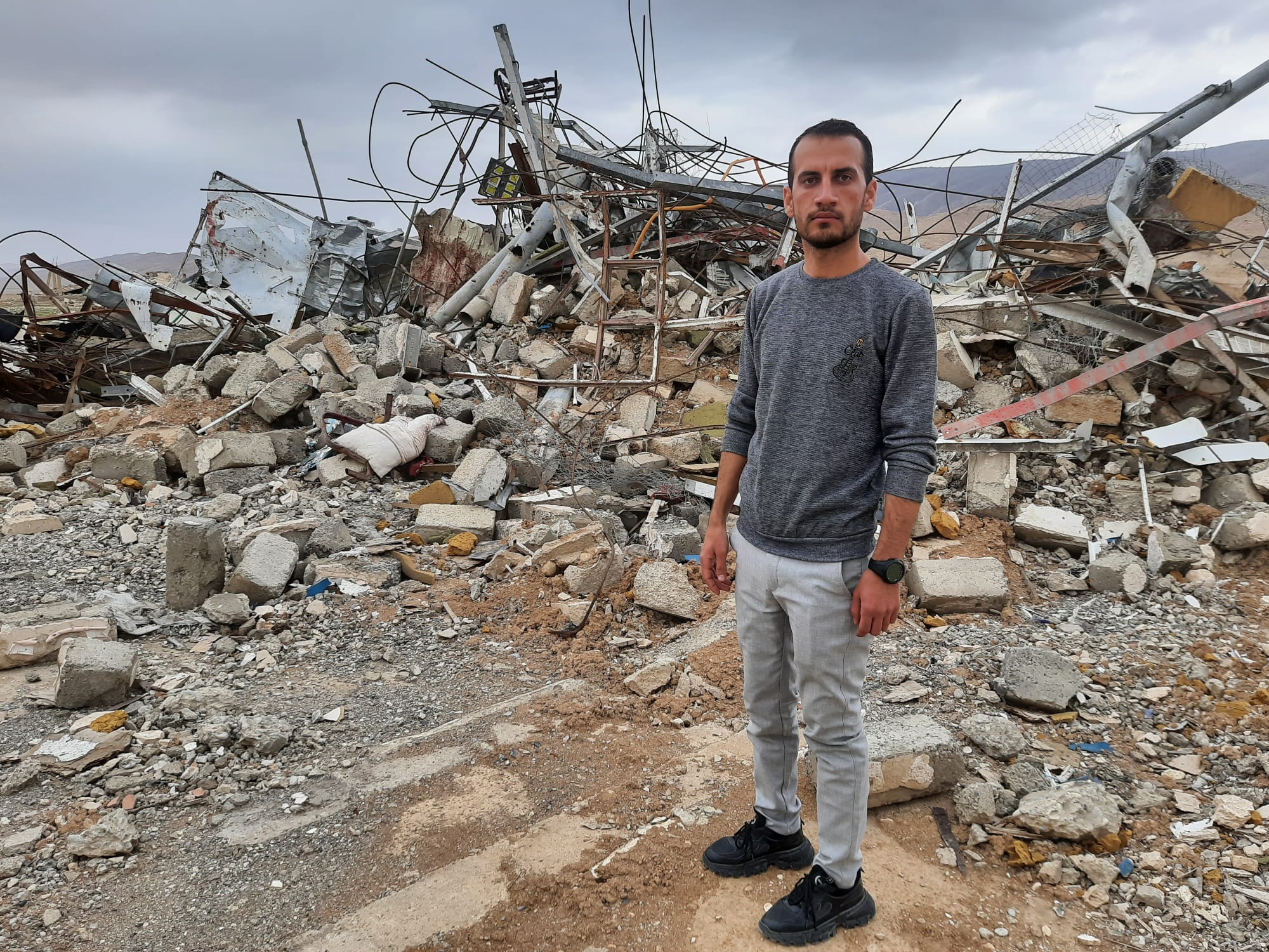 Shoresh3 steht sichtlich bewegt vor dem zerbombten Spital in Sekenyie, im Süden des Shengal-Gebirges. Er ist Chemiker und Mitglied des ezidischen Gesundheitskomitees. «Im August letzten Jahres sind sie gekommen, Erdogans Flugzeuge, und haben das Krankenhaus zerbombt. Wir standen nur 300m entfernt am Checkpoint. Die irakischen Soldaten liessen uns nicht durch. Wir wussten nicht warum. Kurz darauf haben wir begriffen: sie wussten, dass es einen Bombenangriff geben wird.» Auf die Bomben folgten Drohnen, die gezielt auf die Eingänge des Gebäudes schossen, damit niemand dem Angriff entkommen konnte. «Acht Menschen wurden dabei getötet», erzählt Shoresh weiter, «drei Krankenpfleger*innen, ein Arzt und vier weitere Zivilpersonen. Eine Woche zuvor hatte ich ihnen eine Weiterbildung zu Laboranalysen gegeben. Jetzt sind sie tot, unter ihnen ein sehr guter Freund von mir.» Wir stapfen gemeinsam über die Trümmer, entdecken Laborutensilien, Röhrchen und Fläschchen, zerstörte Liegen, Plastikspritzen. «Hier wurden neben Zivilpersonen auch verletzte oder kranke Militärs versorgt, sowohl von der irakischen Armee wie auch von den Ezidischen Selbstverteidigungskräften. Wir haben alle behandelt.»
