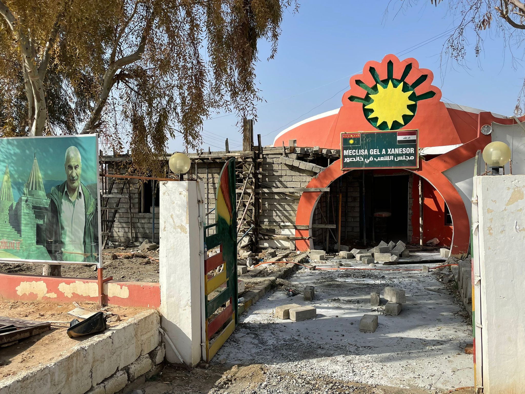 Eine halbe Stunde Autofahrt entfernt erreichen wir das Dorf Xane Sor am Nordfuss des Gebirges. Dort steht ein Krankenhaus der Ezidischen Selbstverwaltung. Nach dem Angriff auf das Spital in Sekenyie haben viele Fachkräfte den Ort verlassen. Sie wollten nicht Zielscheibe eines nächsten Angriffes werden. Denn es ist klar: die türkischen Streitkräfte greifen gezielt Einrichtungen der Ezidischen Selbstverwaltung an. Auch das Ezidische Gemeindezentrum, ein Ort für Versammlungen und religiöse Feiern, wurde von Drohnen beschädigt. Die über dem Eingang hängende Sonne – ein Wahrzeichen der Ezidischen Identität – ist durch den Angriff in Schieflage geraten. Nun soll sie wieder ins Lot gerückt werden und stolz über dem Eingang prangen. Seit dem Genozid durch den IS kämpft die Ezidische Gemeinschaft für den Erhalt ihrer Kultur und ihres Glaubens. Nach dem Vorbild der kurdischen Selbstverwaltung in Rojava haben sie begonnen, eigene zivile und militärische Strukturen aufzubauen und sich selber zu verteidigen. Ihre Ressourcen sind bescheiden und knapp. Ihre Kraft ist der Zusammenhalt, der Wille zum Widerstand und zur Verteidigung der eigenen Identität und und Würde.