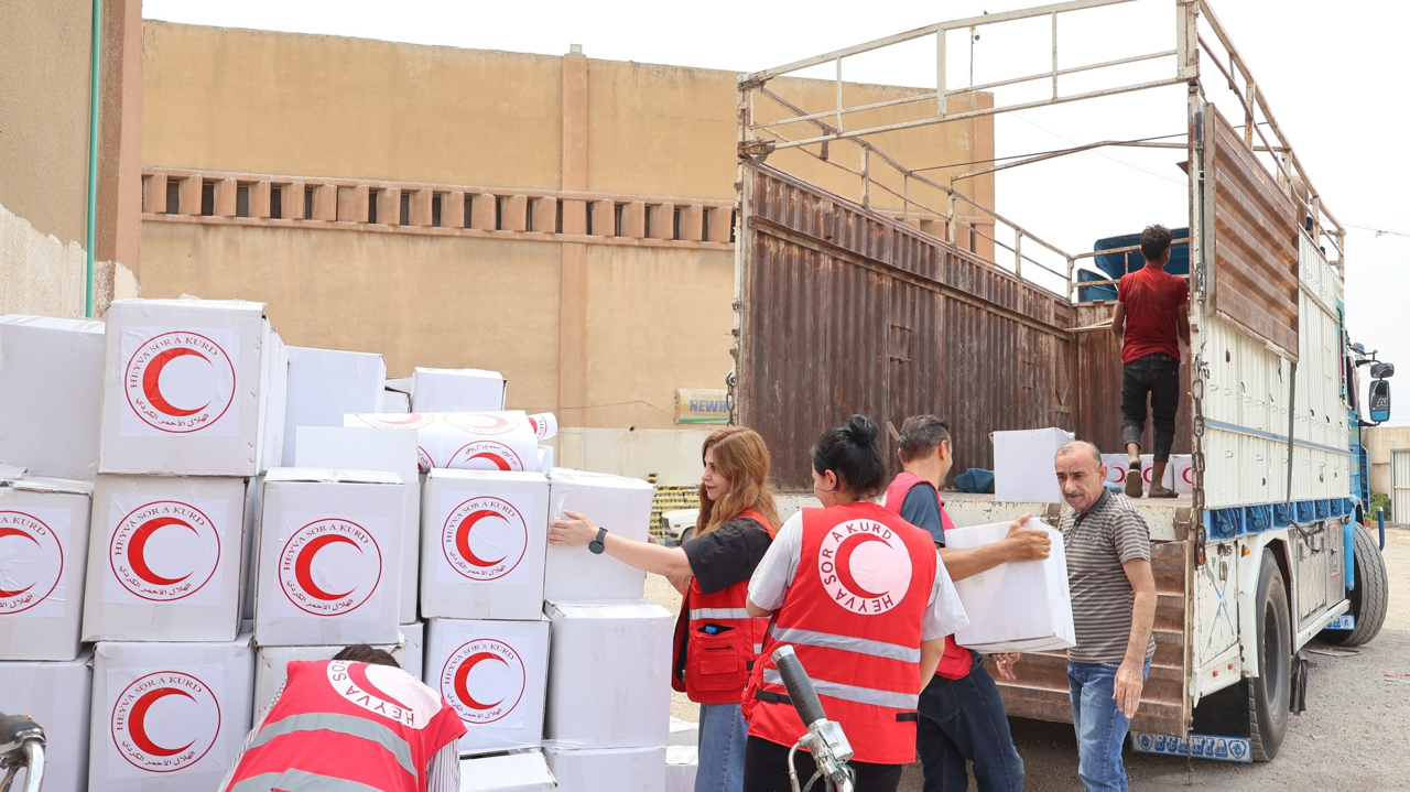 Hilfsgüter für die Menschen in Suweida werden auf die LKWs des Kurdischen Roten Halbmondes verladen.