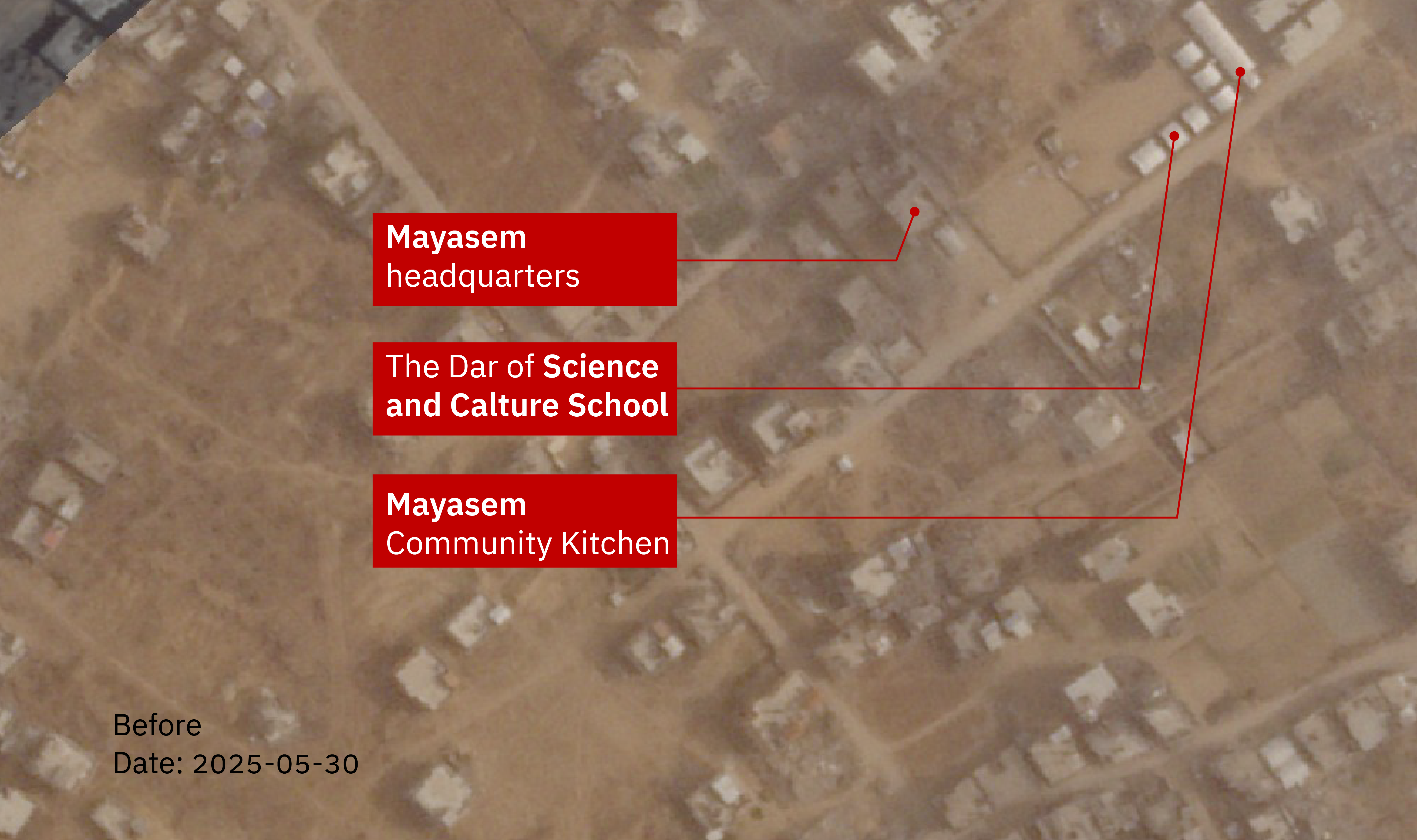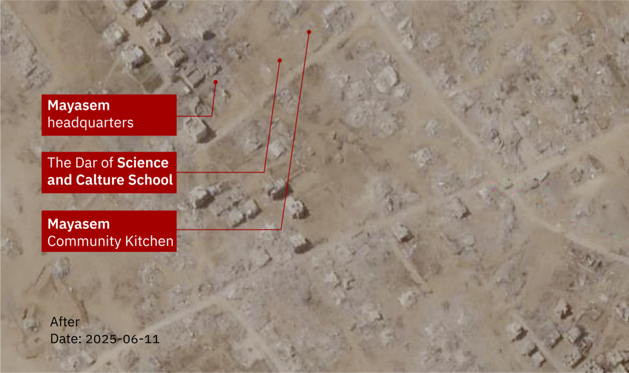 Die Satellitenbilder zeigen den Ort vor und nach der Zerstörung der Mayasem-Einrichtungen.