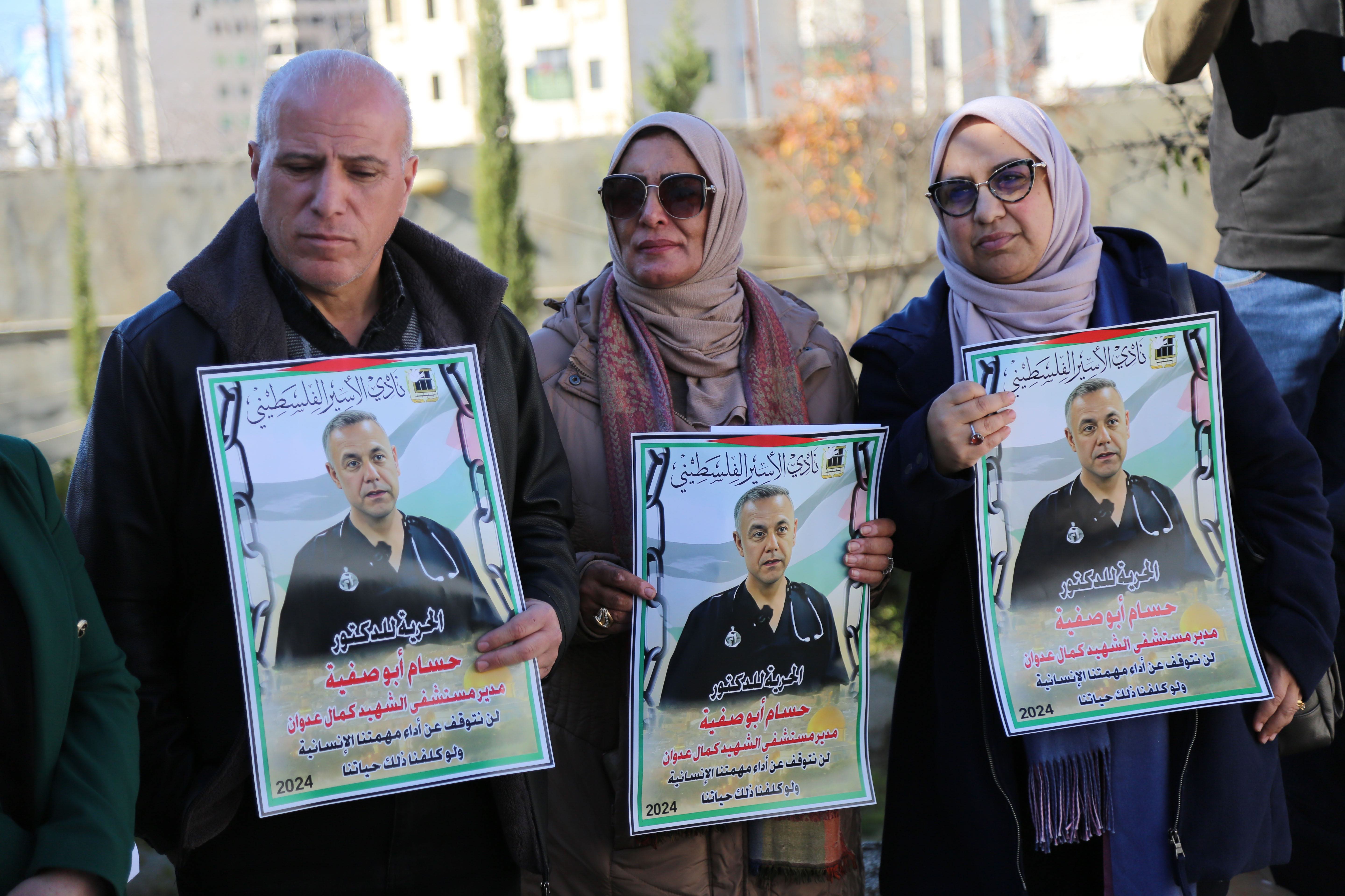 Hebron, Januar 2025: Proteste gegen die willkürliche Festnahme von Dr. Hussam Abu Safiya, Direktor des Kamal Adwan Spitals in Beit Lahiya, und die gezielte Repression gegen medizinisches Personal in Palästina. Auf den Plakaten der protestierenden Gesundheitsarbeiter*innen steht: «Wir werden unsere humanitäre Pflicht nicht aufgeben – selbst wenn es uns das Leben kostet.» ©Activestills, Mosab Shawer